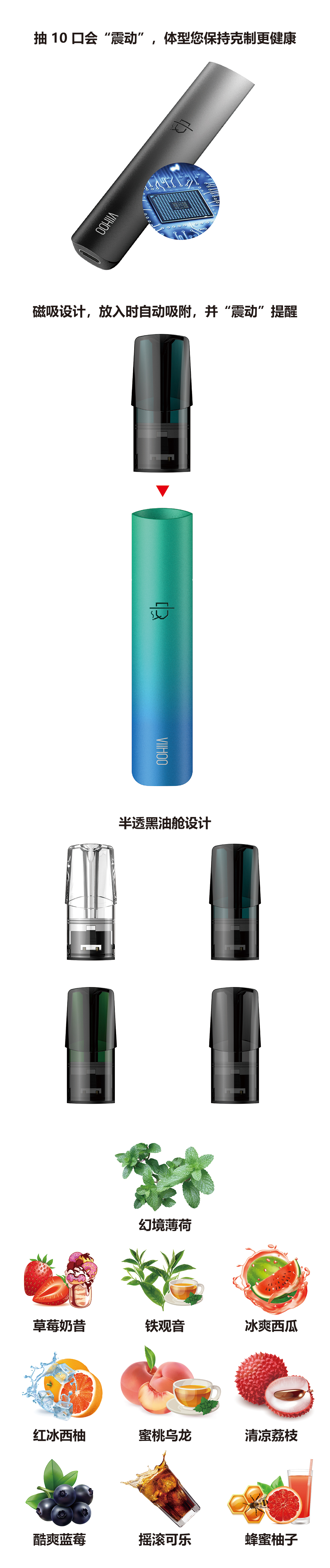 Use a two-color gradient design. The cigarette rod is made of aluminum alloy oxidation, which has an excellent feel. There are more than 30 flavors such as pineapple coconut, raspberry, and strawberry donuts for you to choose from.